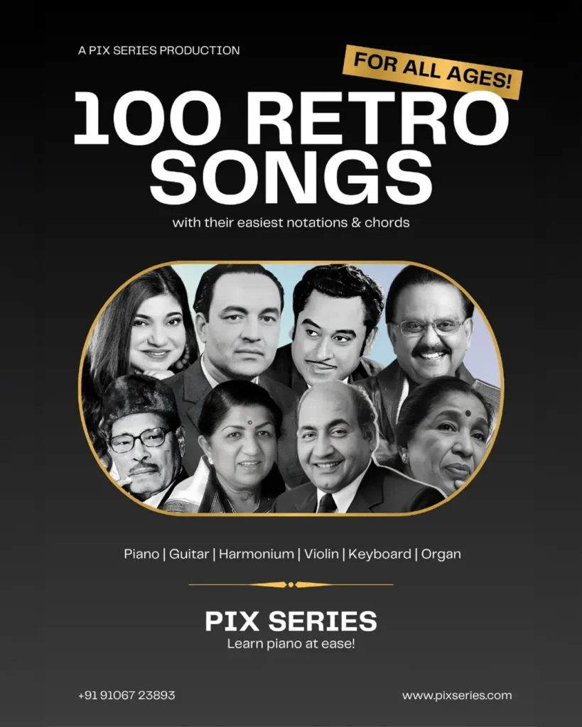 This eBook is your go-to guide to mastering 100 timeless Bollywood retro songs with complete notations and chords. Designed for beginners and hobbyists, it works across instruments like piano, guitar, keyboard, violin, harmonium, and organ — all in an easy-to-read format with labeled sections, octave markings, and slow-tempo demonstration videos.
